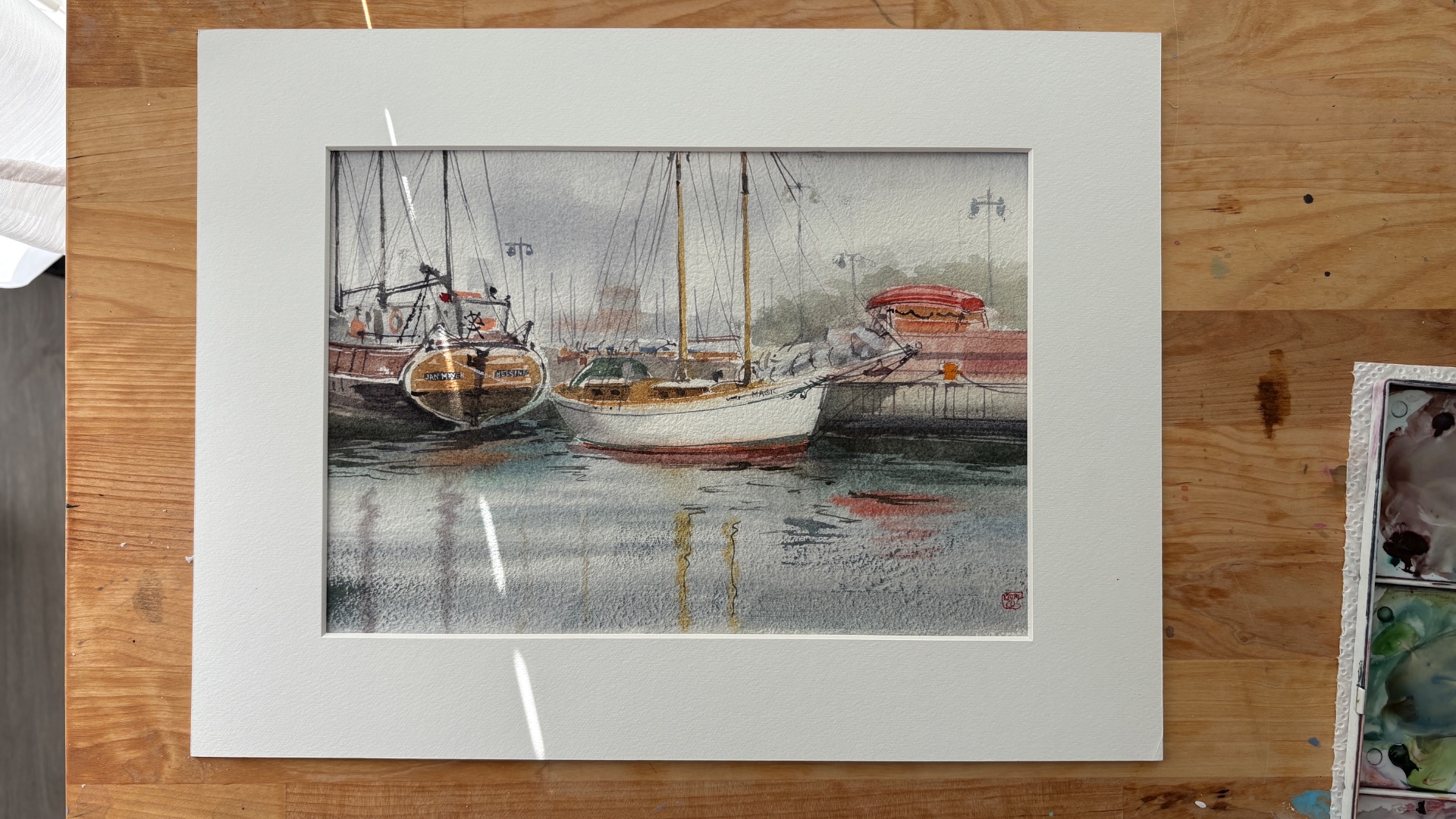 Painted en plein air at the Jan Mayen boat café in Katajanokka, this work captures a quiet harbor moment just as it was unfolding. The weather was moody and damp, the air heavy with sea mist, and everything moved a little slower. I painted directly by the water, letting the shifting light, the muted colors, and the calm rhythm of the harbor guide each brushstroke. It's a small memory of standing there, feeling the cold air, listening to the boats, and watching the harbor breathe.